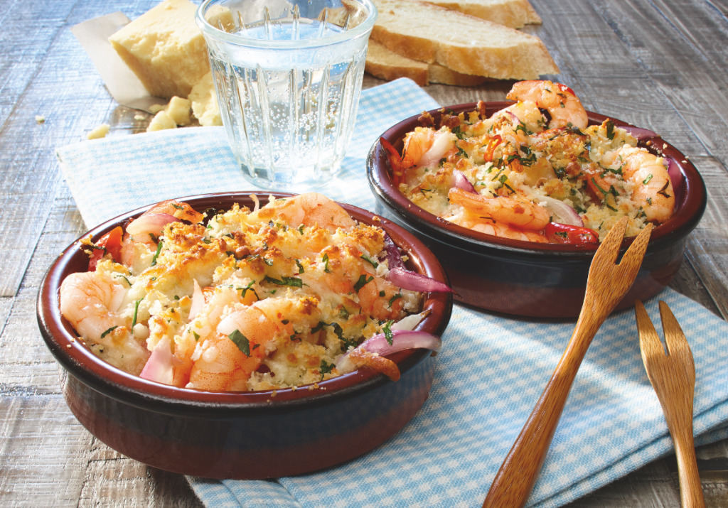 Une entrée simple et surprenante : les crevettes gratinées au parmesan de la gamme « Costa », leader des fruits de mer surgelés en France.